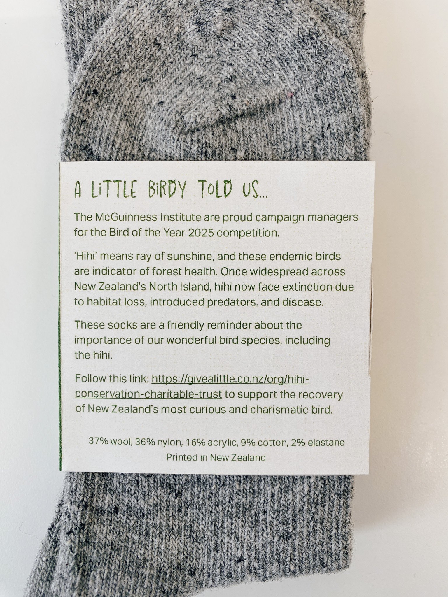 We will donate $5.00 from every sock purchase back to the Hihi Conservation Charitable Trust (https://givealittle.co.nz/org/hihi-conservation-charitable-trust) to support the recovery of Aotearoa New Zealand's most curious, charismatic & colourful bird.